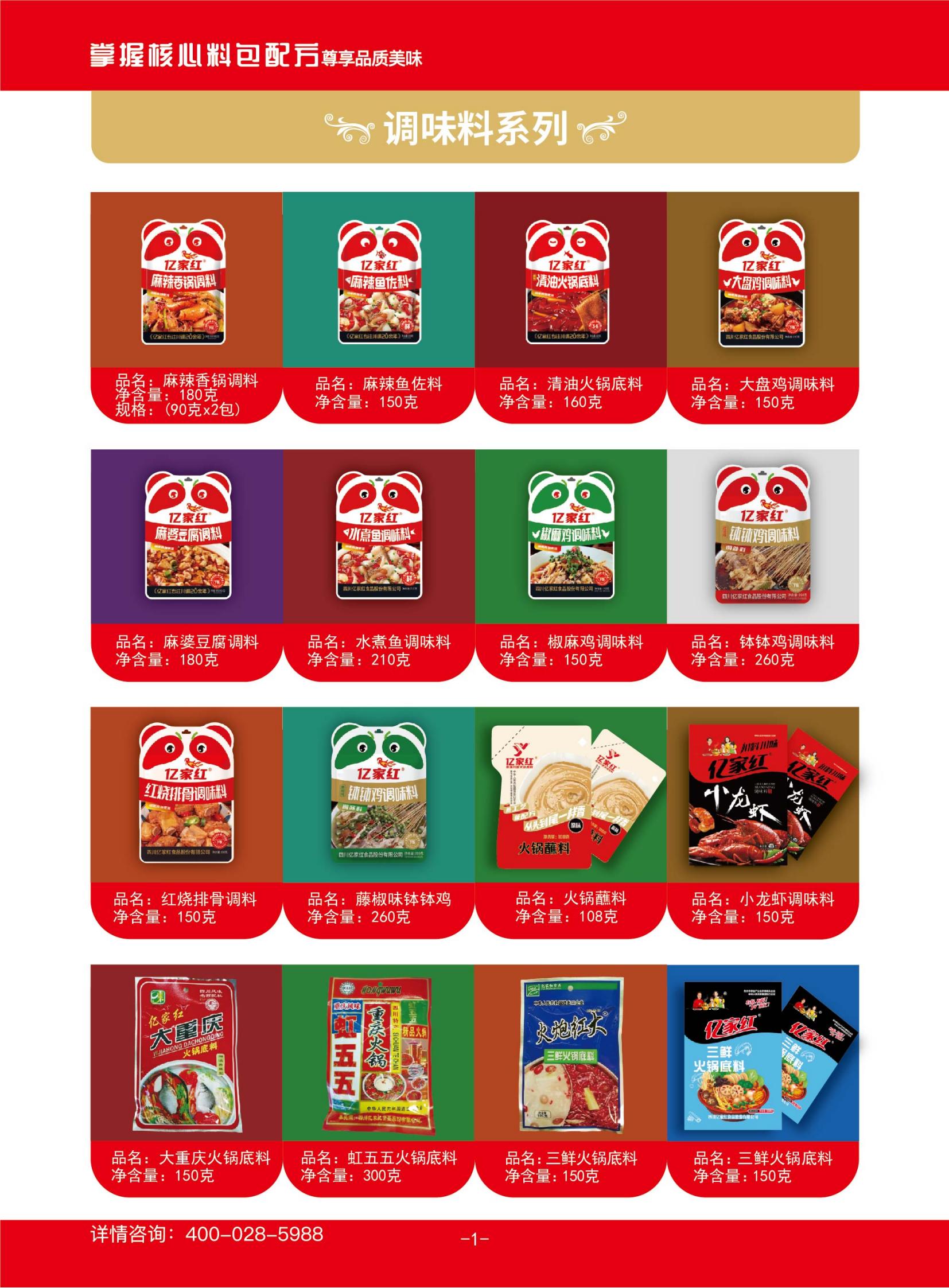 河南亿家红调味食品有限公司创建于2011年,占地30余亩,注册时间2012年6月28日,注册资本100万元,公司现有职工185人,其中研发人员6人。公司有调料车间、菜肴包车间、自热系列车间和预制菜车间,共计6条生产线。年产调味料产品1.4万吨。主要经营生产销售调味料(液体、半固态、复合调味酱、风味酱、调味油)、“亿家红”系列火锅底料、川味调料、烧烤酱、方便菜肴包、预制菜、自热煲仔饭、自热小火锅等系列产品、“麻辣香锅调味料”、“黄焖鸡调味料”、“酸菜鱼调味料”、“酸菜粉面调味料”、“香辣小龙虾调味料”等系列复合调味料,自营产品进出口。