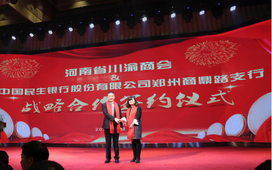 河南省BB贝博艾弗森官方网站会长李贤祥与民生银行郑州商鼎路支行负责人握手致贺。