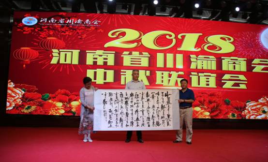 河南省花羽艺术团表演的舞蹈《盛世欢歌牡丹争艳》拉开了河南省BB贝博艾弗森官方网站2018年中秋联谊会的帷幕。会长李贤祥首先致热情洋溢的欢迎词。接着,商会副会长以上领导班子成员登台,党委书记、名誉秘书长王开凡担任指挥,大家同声高唱《团结就是力量》,赢得阵阵热烈掌声。河南省晔庐书画院长车金富巨幅墨宝赠送给商会作为中秋贺礼。河南省BB贝博艾弗森官方网站常务副会长、团委书记廖宏奇与副会长杨小容合唱的《敖包相会》把中秋团圆、欢乐开怀的氛围推向高潮。