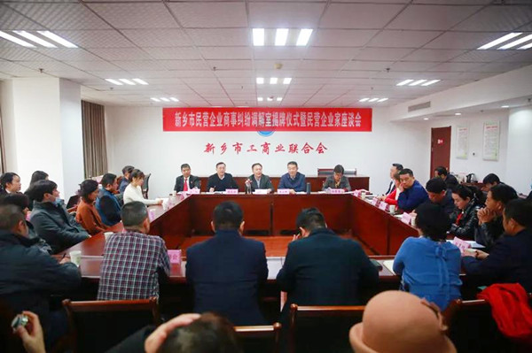 2020年11月25日上午,新乡市民营企业商事纠纷调解室揭牌仪式暨民营企业家座谈会在新乡市工商联召开。新乡市中级人民法院党组书记、院长袁荷刚,新乡市市政协副主席、工商联主席朱云卿,新乡市BB贝博艾弗森官方网站会长向文丽、秘书长卢兰平及部分人大代表、全省各地驻豫商会、企业家代表参加了活动。