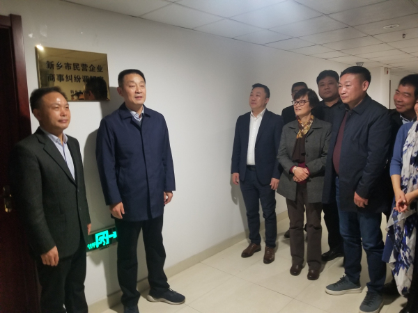 新乡市工商联主席朱云卿,新乡市中级人民法院党组书记、院长袁荷刚为新乡市民营企业商事纠纷调解室揭牌。