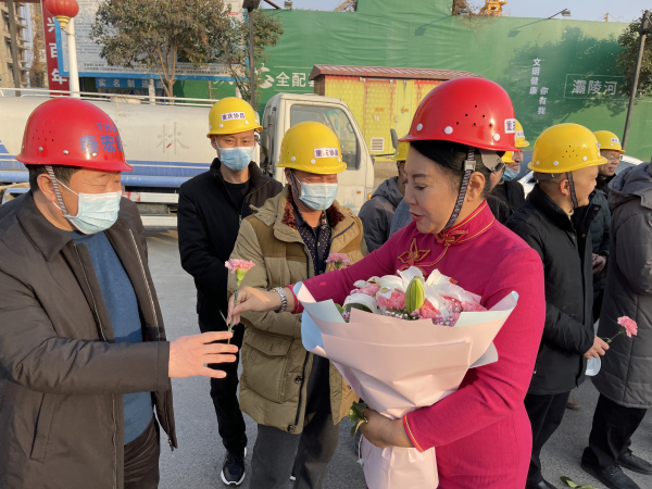 “网红薛书记”、薛荣会长来到建筑工地时,农民工代表给她献了花,大家鼓掌表示热烈欢迎。接着,薛荣会长同大家一一握手,嘘寒问暖,送给棉被御寒物品表示慰问。