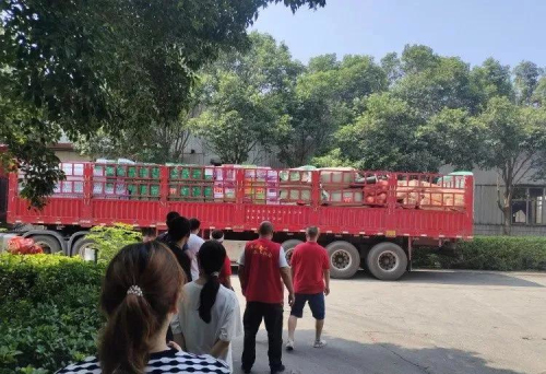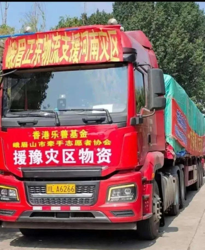 2021年7月27日上午,两辆15米的大卡车满载着救灾物资驶入凤泉区耿黄镇政府救灾物资接收点。这批物资是由四川省众城爱心慈善促进会、四川省峨眉山市牵手志愿者协会组织的价值25万元的食品、饮料、蔬菜、消杀用品。