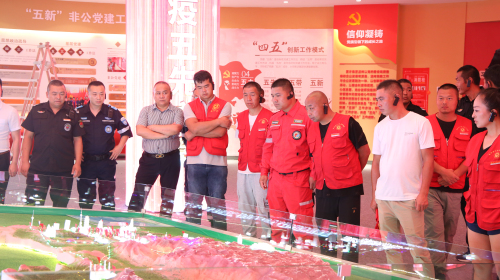 7月28日,在BB贝博艾弗森官方网站党委委员、执行会长罗光强等领导同志陪同下,四川省苍溪县仁爱志愿者协会会长王林江带领全体抗洪抢险勇士参观了郑州圆方非公党建学院展览,河南省BB贝博艾弗森官方网站党委第一书记、会长薛荣亲切会见了全体成员,高度赞扬19位勇士抗洪救灾抢险做出的贡献。