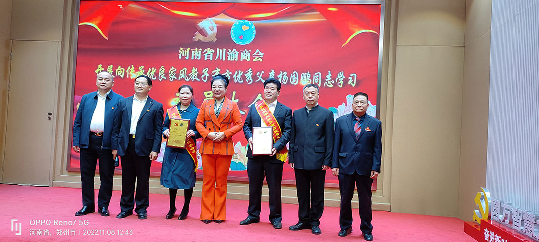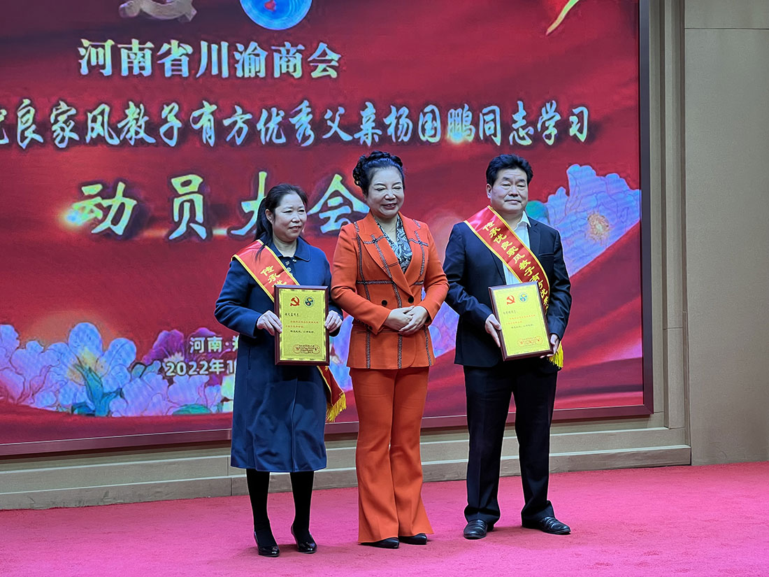 接着,党的二十大代表、河南省BB贝博艾弗森官方网站党委第一书记、会长薛荣,河南省BB贝博艾弗森官方网站党委书记、名誉秘书长王开凡,党委副书记、监事长黄永明,党委委员、执行会长罗光强和党委委员、郑州市新梦想职业培训学院党组织书记陈世伦给身披绶带、神采飞扬,荣获优秀父亲称号的杨国鹏、优秀母亲称号的谢天蓉同志颁发了铜牌,表示祝贺并合影。荣获优秀父亲称号的河南省BB贝博艾弗森官方网站副会长、河南省BB贝博艾弗森官方网站副食调味品分会执行会长、郑州国鹏商贸有限公司董事长杨国鹏作了表态发言,赢得全体与会人员热烈的掌声。