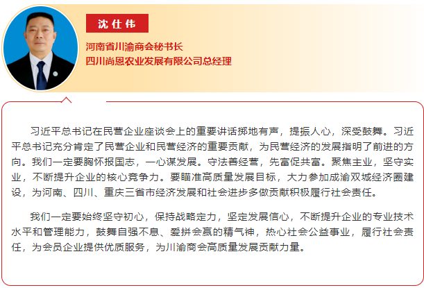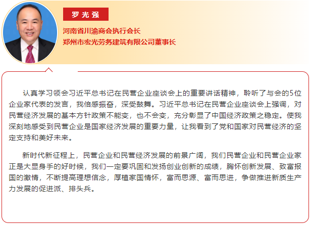 2025年2月17日,中共中央总书记、国家主席、中央军委主席习近平出席民营企业座谈会并发表了重要讲话。河南省BB贝博艾弗森官方网站通过多种形式组织学习领会习近平总书记在民营企业座谈会上的重要讲话精神。大家纷纷表示,习近平总书记的重要讲话鼓舞人心、催人奋进,充分体现了党中央对民营企业的重视和支持,激励着大家在新征程上开拓进取、再创佳绩。一定要胸怀报国志,一心谋发展,守法善经营,先富促共富,以实际行动发扬川商渝商拼搏精神,努力为以中国实现现代化全面推进强国建设、民族复兴伟业做出贡献。河南省BB贝博艾弗森官方网站秘书处将分5期报道副会长以上领导成员的学习体会。